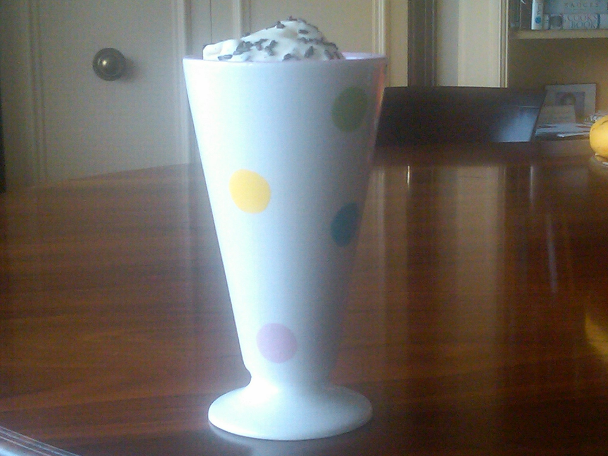 3) While the gelato is churning, make the chocolate. (Now the recipe calls for you to melt chocolate over the stove, but all I did was chop up 2 ounces of bittersweet chocolate, finely chopped, and melt it in a microwave safe bowl) – Heat the chocolate on high power for 20 seconds, then stir. Repeat once or twice as needed until almost all the chocolate is melted, the last bites of chocolate will melt just by stirring.