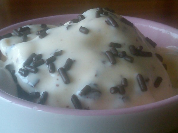 5) Transfer to an air tight container and freeze for at least 2 hours before serving. Or, if you have no patience like allanabytes, eat it right when it’s done churning – perfectly creamy, chocolately, vanilla goodness.