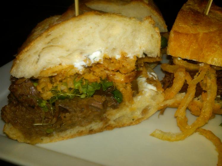 Braised Short Rib Sandwich with Fried Onions, Horseradish Sour Cream + Watercress
