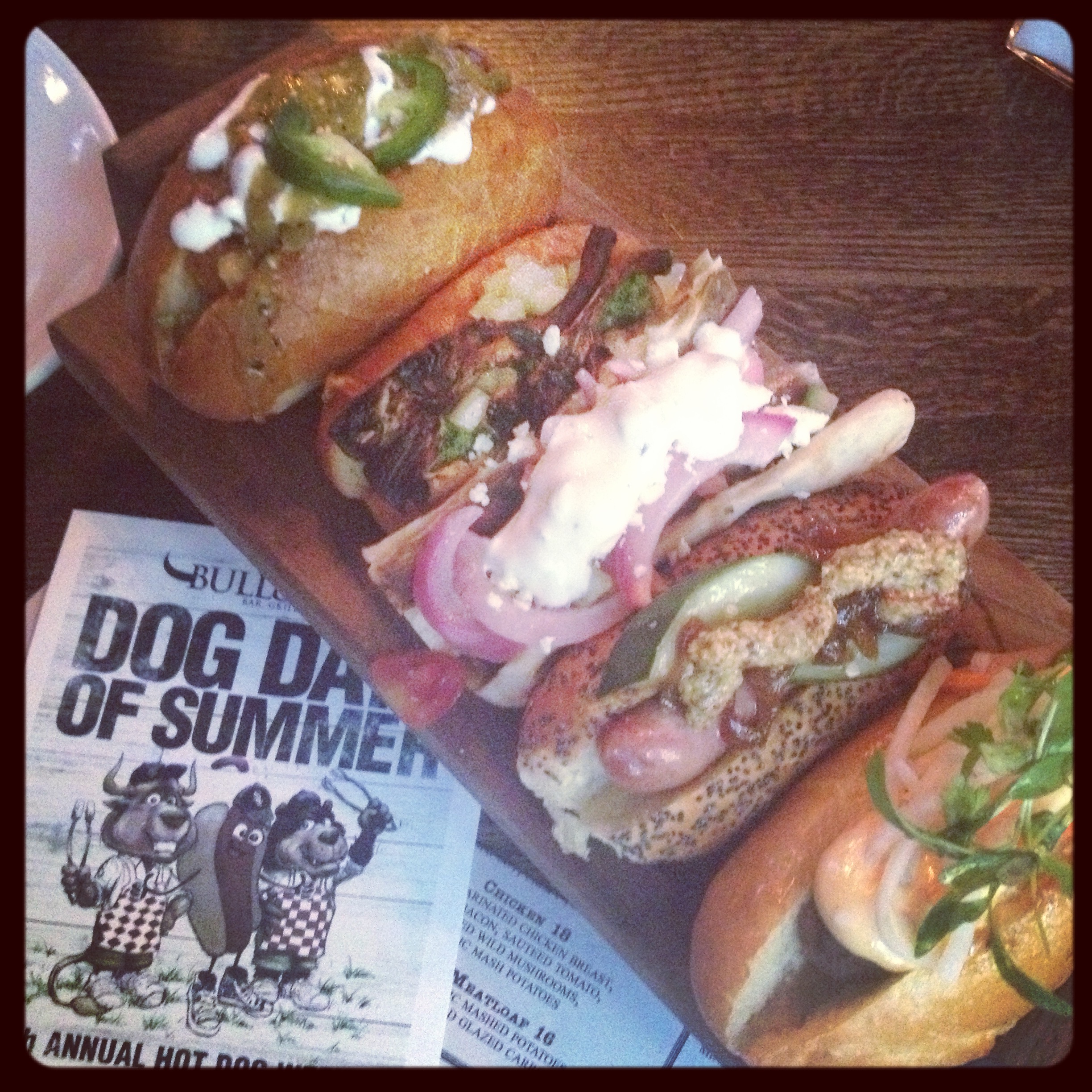 dogs1Four years ago, Bull & Bear started dedicating an entire week of celebrations to hot dogs, because lets be honest, one day simply isn’t enough. 24 hours is a tease for a holiday if you think about it, just like that ridiculous 7/11  Slurpee Day (I’m still bitter I never got my free coke slushy). The folks over at Bull & Bear are doing some serious celebrating, if your serious celebrations include gourmet hot dogs with insane toppings such as pineapple & cactus relish, salami pepperoncini sausage and dehydrated cilantro (not all together, I promise).
