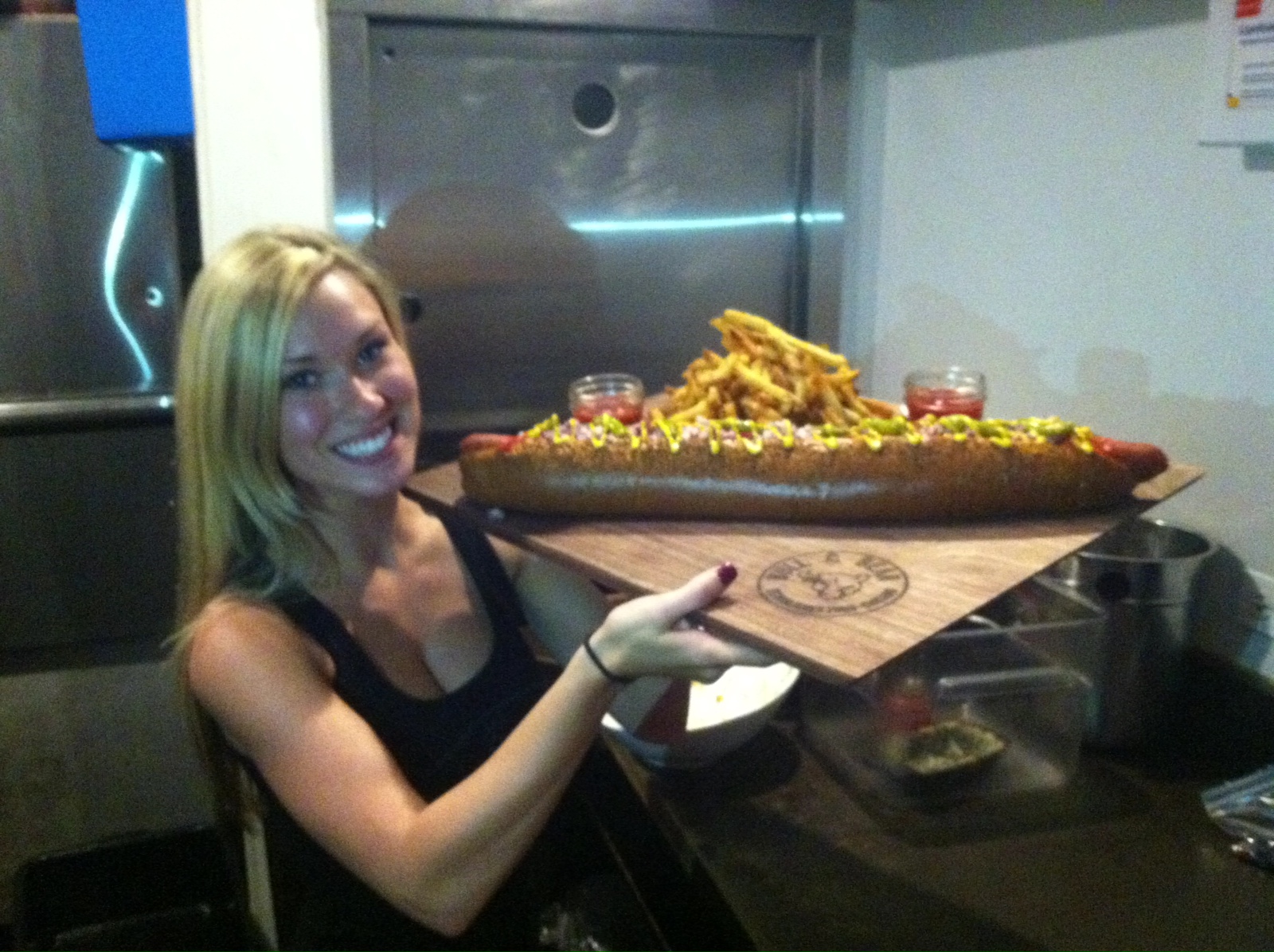 As a hot dog fiend, I thoroughly enjoyed each mini. My least favorite was Friday’s pick (uptown dog) only because I found it slightly spicier than the rest. However, if you’re a fan of ’em hot – you’ll probably love it! Overall, I think what Bull & Bear is doing this week is fabulous – and given the location of the restaurant, happy hour prices, high energy and fun vibe (and yes, wonderful service), I can’t think of any other place I’d rather hang at this week. And if you like hot dogs, you really have to check it out. And if you’re really hungry, brave and a fan of competitive eating, you have to try the Homewrecker. If you yourself finish the 22-inch sausage in one sitting, you get a $25 gift card & Homewrecker Chamption t-shirt compliments from B & B. I saw one dude order the monstrosity and oh-my-god, it was so awesome. Order it – then tweet me and tell me it goes. I’m SO curious. dogs2